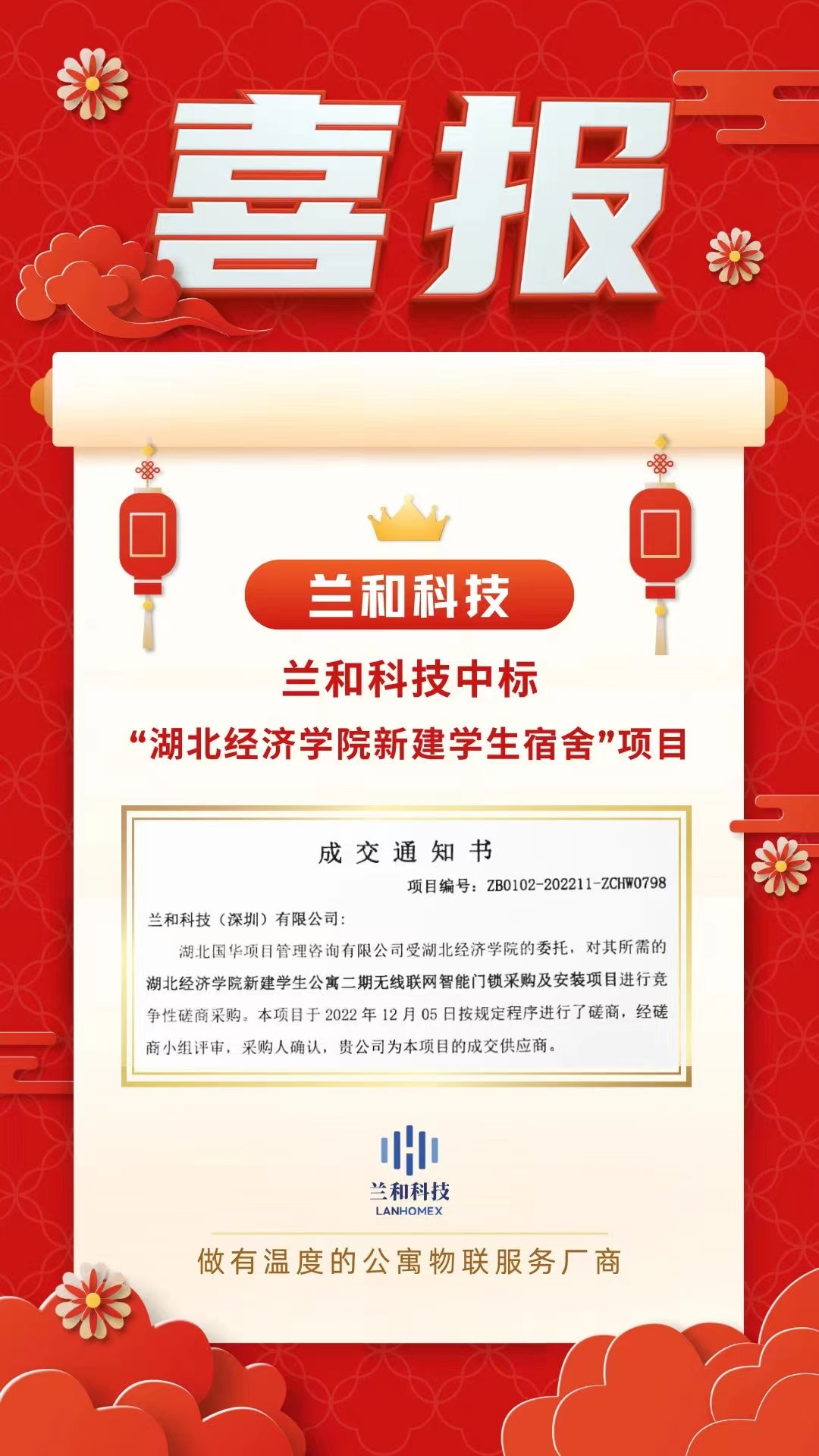 2022年12月5日,经过标准程序磋商,兰和科技(深圳)有限公司成功中标“湖北经济学院新建学生公寓二期无线联网智能门锁采购及安装项目”,本项目计划于2023年3月31日前交付并安装调试完成。